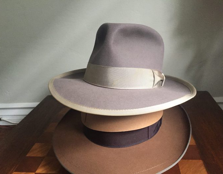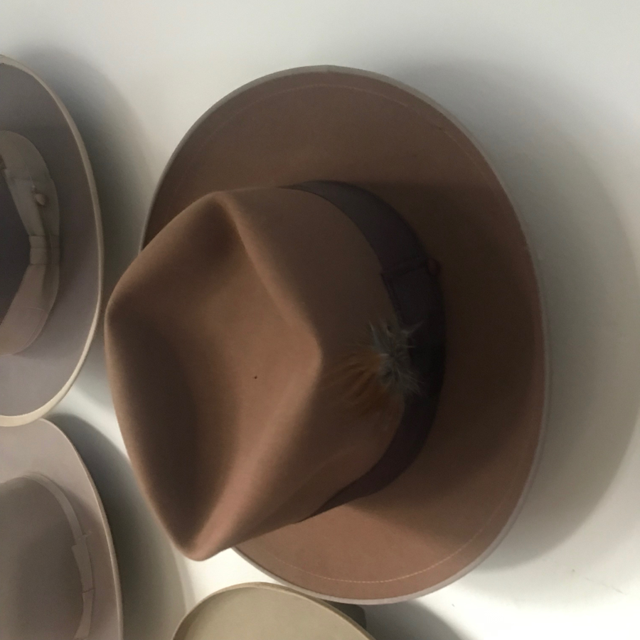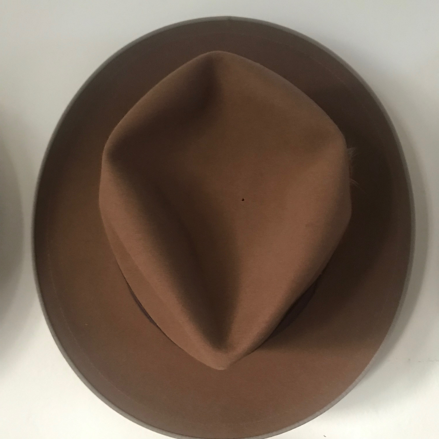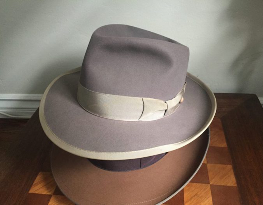 This collection fetures a second Grey 40’s Whippet style Fedora. These two hats are from an old California University club member. Each size 718 reg/oval. The Whippet Fedora, an iconic hat both a stylish, versatile hat known for its timeless appeal, and sophistication.