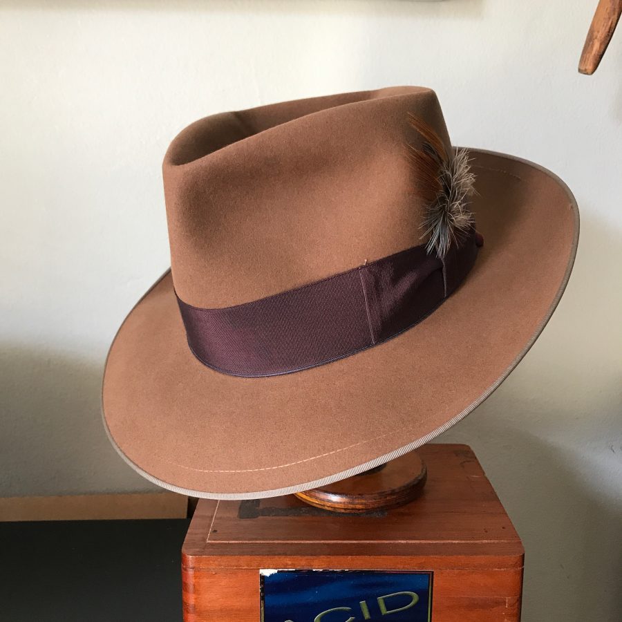 Made in America, the Craxton 1940 fine fur felt Whippet fedora was custom-made in California. What a nice Christmas present this will be. A true American vintage hat with a classic high crown in fantastic condition. It’s a 1940’s Caxton Craft Fine Fur Felt Premier Whippet. The Craxton is part of our Original Quality Vintage Hat Collection. It is in perfect condition. Original quality vintage hat made in the 1940s. A fantastic dress hat with a custom brown leather sweatband. The sweatband has an original embossed marking -“Men’s Store in California”.