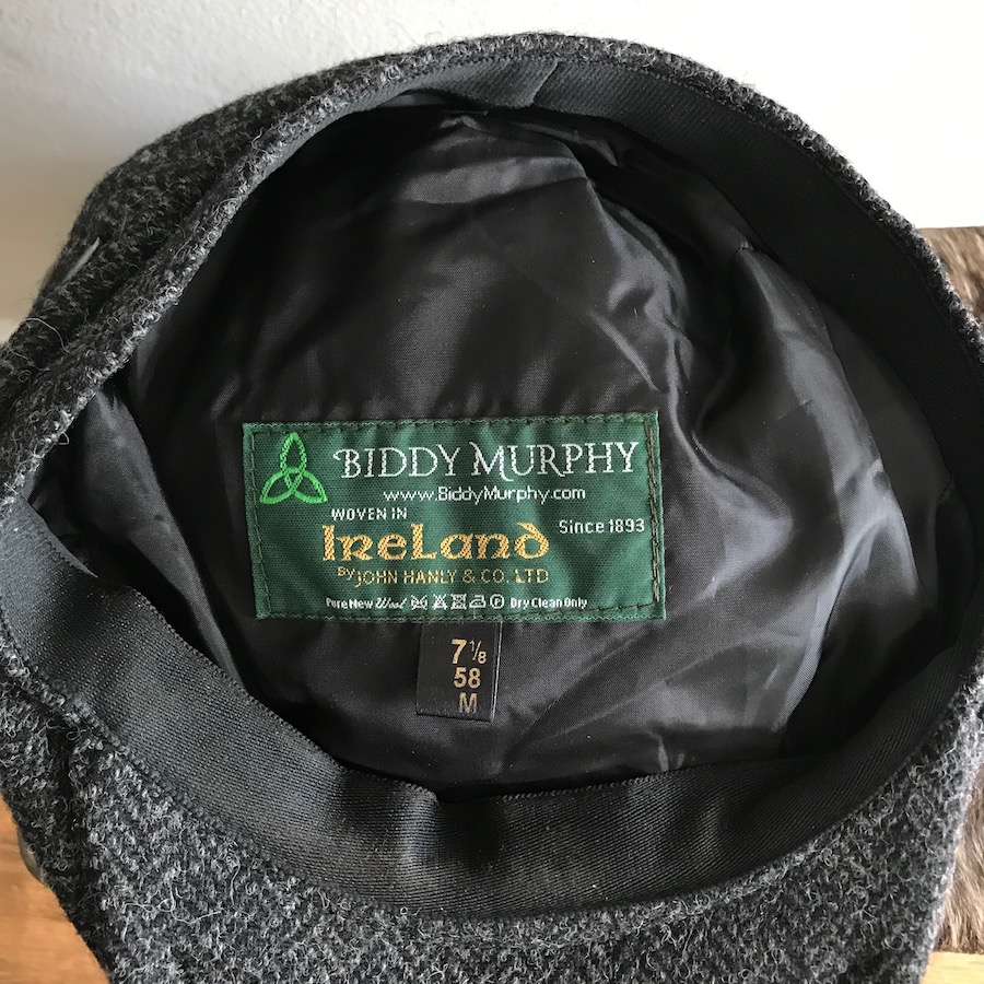 ivy cap dark grey houndstooth made in ireland . logo Biddy Murphy