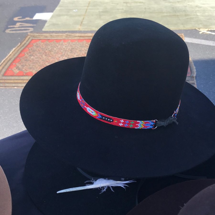 Vintage Western Billy Jack 5X Quality Replaced Sweatband. Tall Open Crown Black Raw Edge Flat Brim. Stiff fur felt construction. Weaved beefed Indian band included long feather